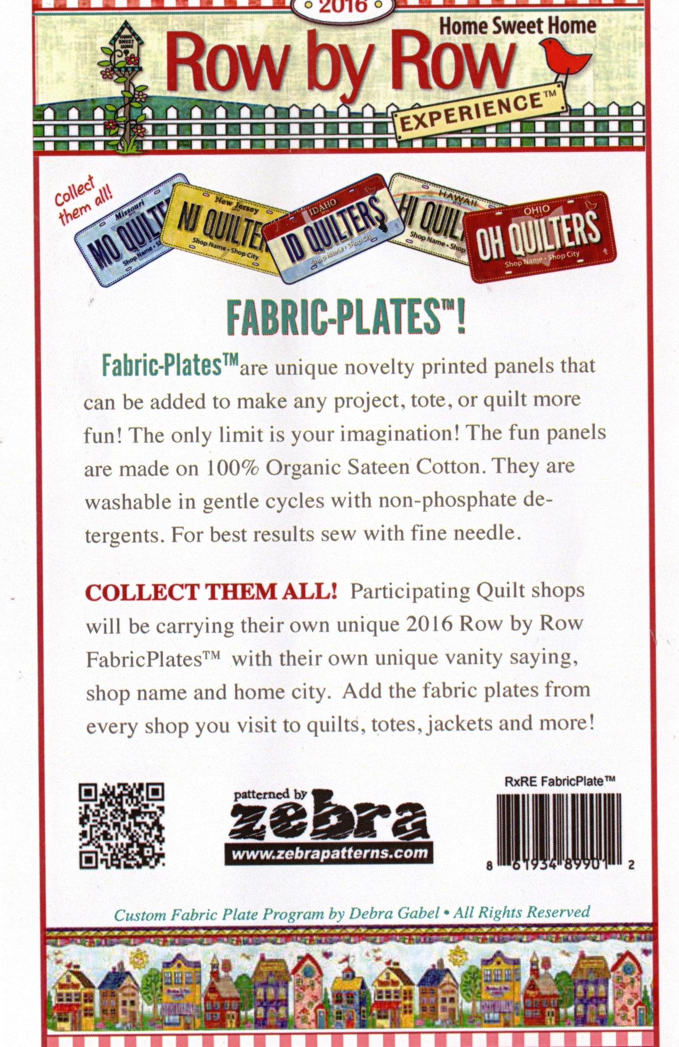 Row by Row Fabric Plates, are unique novelty printed panels that can be added to make any project, toe, or quilt more fun.  The only limit is your imagination!  The fun panels are made on 100% Organic Sateen Cotton.  They are washable in gentle cycles with non-phosphate detergents.  For best results sew with a fine needle.  Fabric is 4 2/5" x 8".